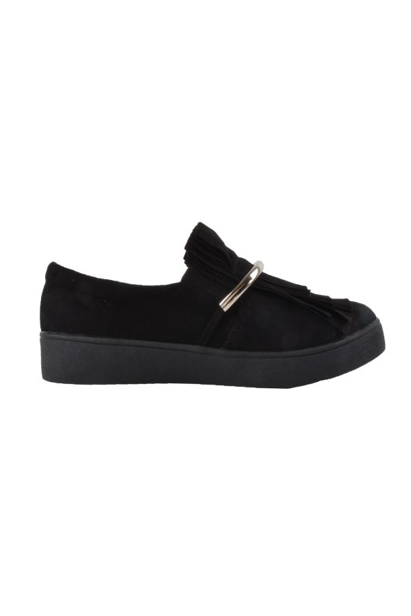 How cut zijn deze zwarte fringe slip ons? De ‘fringe slip on’ is verkrijgbaar in het zwart en gemaakt van mooie pu-suede.