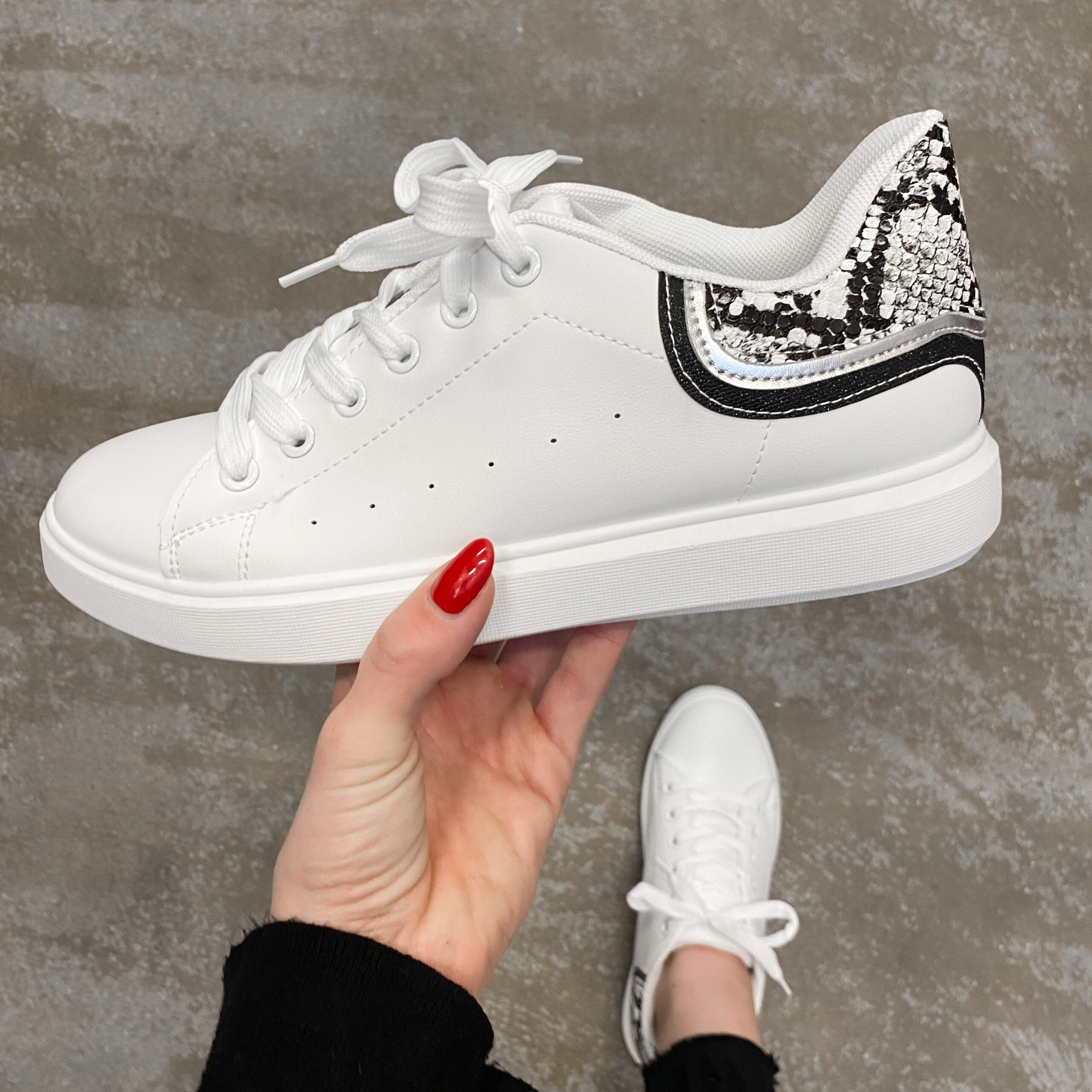 Deze witte sneaker met slangenprint en zwart en zilveren details is toch perfect voor bij elke outfit!